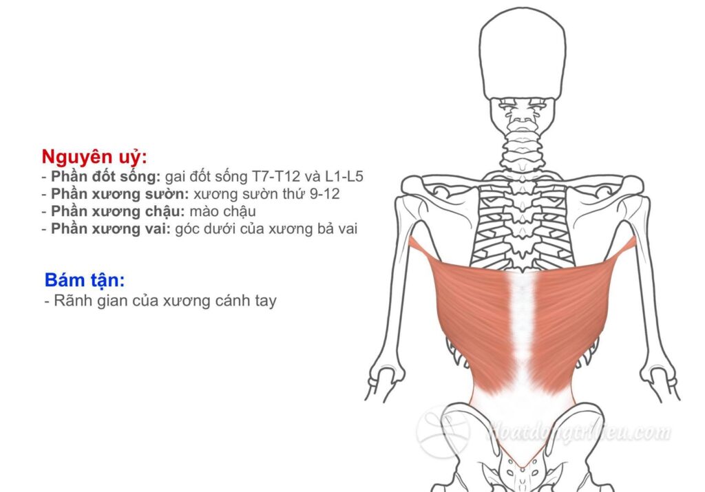 Cơ lưng rộng trải dài qua vùng thắt lưng và ngực dưới của lưng. Gồm 4 phần: