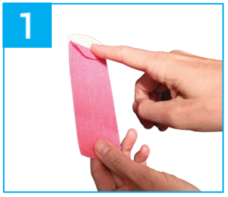Động tác cuộn:Một tay giữ tape, một tay dùng ngón trõ bắt đầu cuộn tape ở đầu góc . Từ từ gỡ toàn bộ mặt giấy phíai sau và dán Tape |