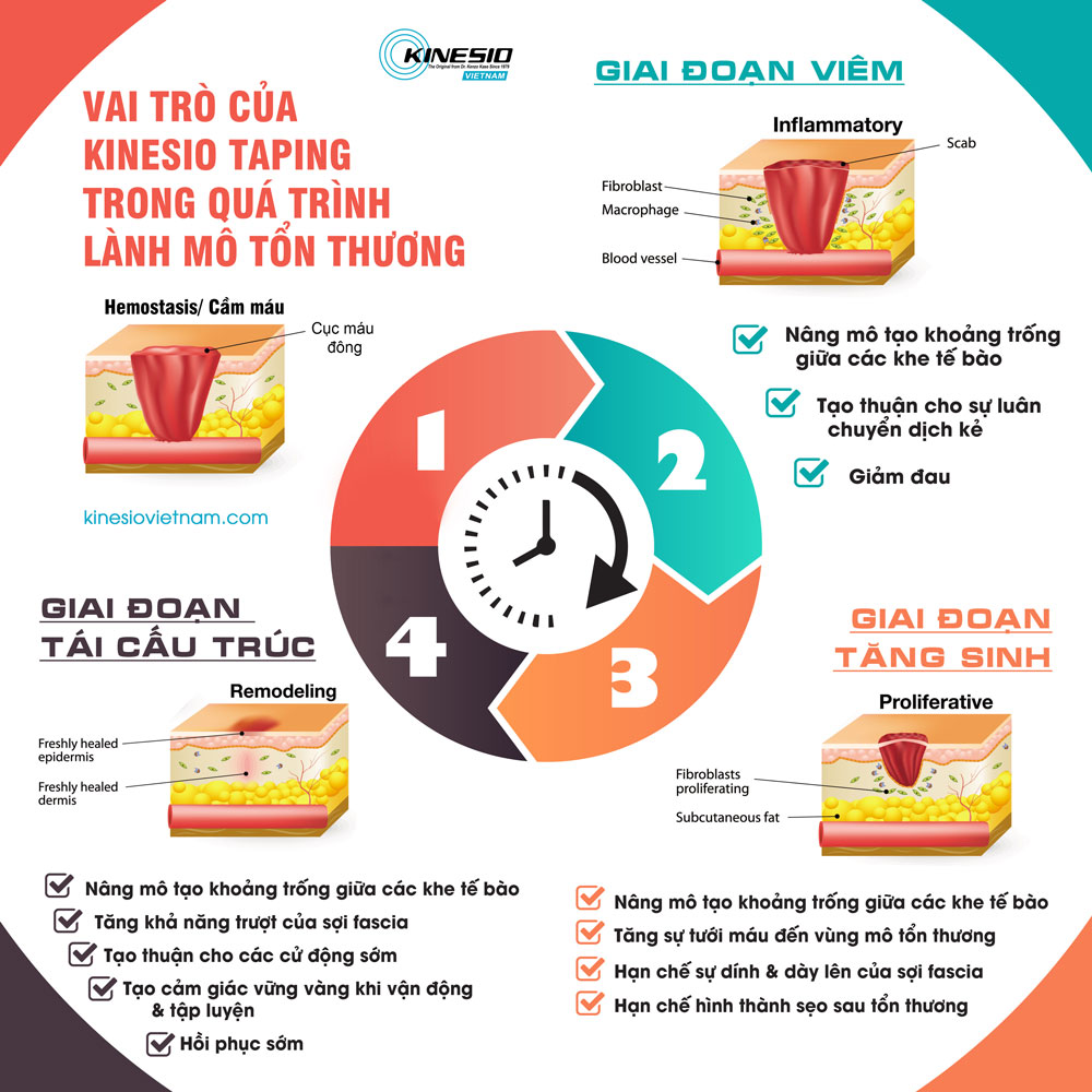 Hiểu được đặc trưng và nguy cơ của từng giai đoạn trong quá trình lành mô sẽ giúp chúng ta ứng dụng được kỹ thuật Kinesio Taping một cách phù hợp.